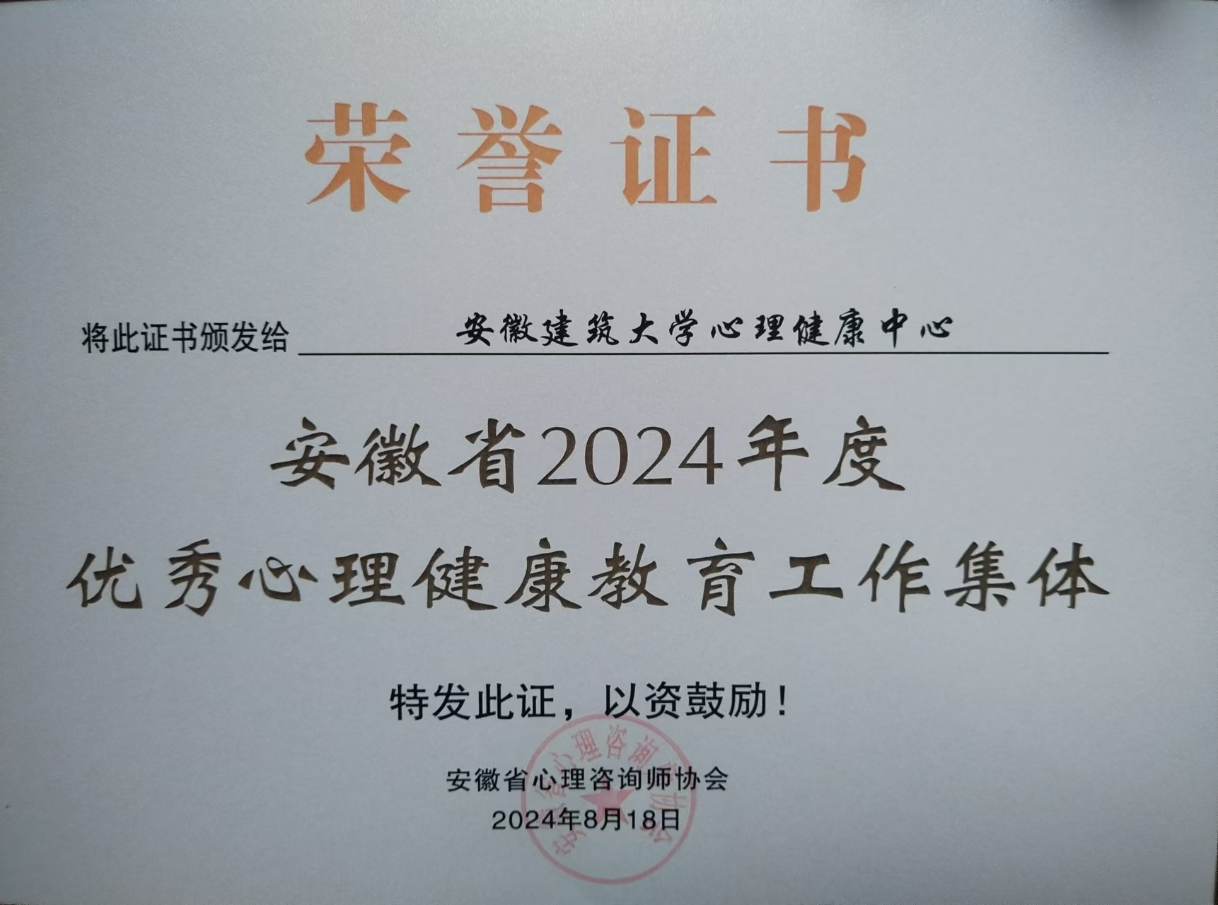 大会表彰了本年度心理健康工作中做出突出成绩的先进集体及个人。经过严格评选,学校荣获安徽省2024年度优秀心理健康教育工作集体荣誉称号,学生处心理健康中心吉晓青老师获“安徽省第三届十佳心理咨询师”荣誉称号。
