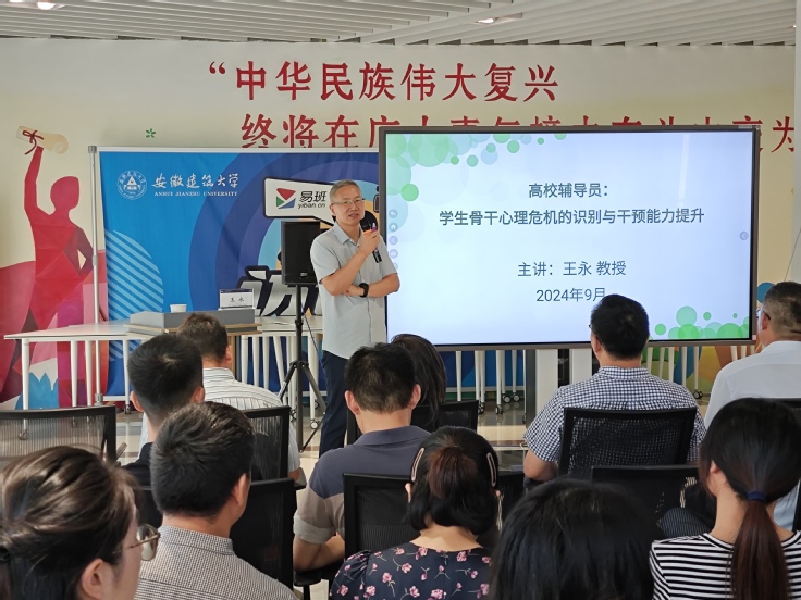 工作坊由马克思主义学院院长、心理健康教育领域专家谢建教授主持,安徽省教育厅高校大学生心理健康教育专家指导委员会委员王永教授担任主讲嘉宾,他通过理论讲授、案例分析和互动交流等多种形式,从大学生心理健康现状、大学生的危机识别,心理骨干“望闻问切”的应对策略,深入浅出地讲解了心理骨干如何做好大学生心理危机的识别与应对。