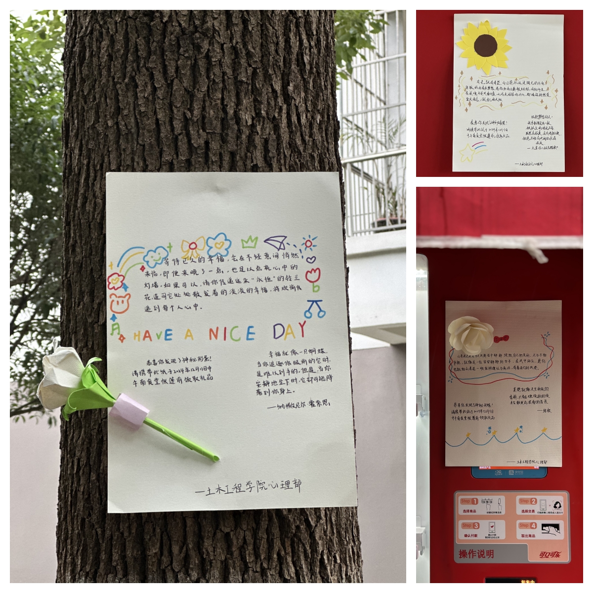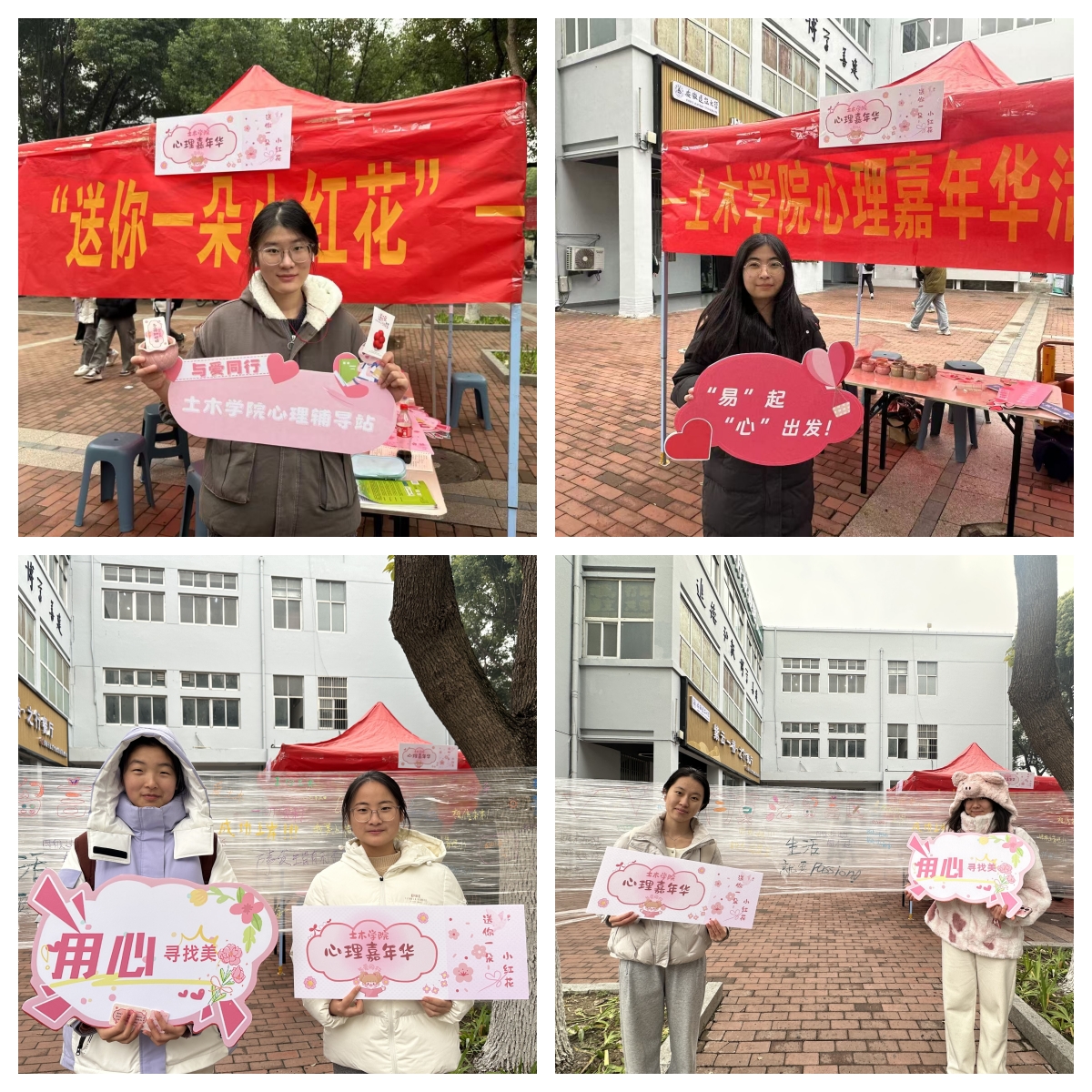本网讯  近日,为传递正能量,不断加强大学生心理健康教育工作,培育大学生自尊自信、理性平和、积极向上的健康心态,推进和谐校园建设,土木学院心理辅导站在南食堂旁开展了“送你一朵小红花”——心理嘉年华活动。本次活动面向全校同学一起参与,大家共同营造一个温暖积极的心理成长环境,也共同见证了一场精彩纷呈的心理文化盛会。