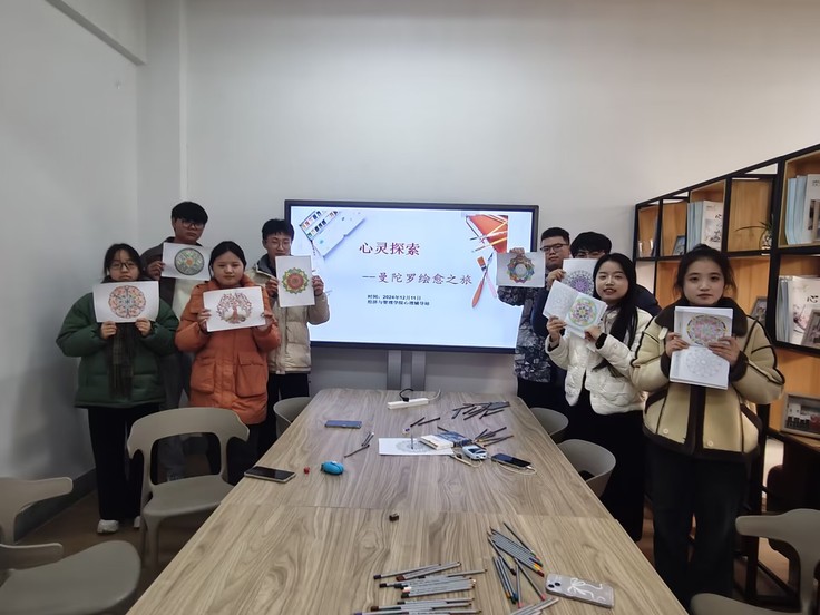 本网讯 为了帮助同学们探索内心世界、提升自我认知,有效调节情绪、缓解压力,12月11日下午,一场别开生面的“心灵探索·曼陀罗绘愈之旅”在金寨路校区F305教室成功举办。活动伊始,主持人首先向同学们介绍了曼陀罗绘画的历史背景和基本原理,强调了它在心灵成长和情绪调节方面的独特作用。随后,同学们纷纷拿起画笔,开始创作属于自己的曼陀罗作品。
