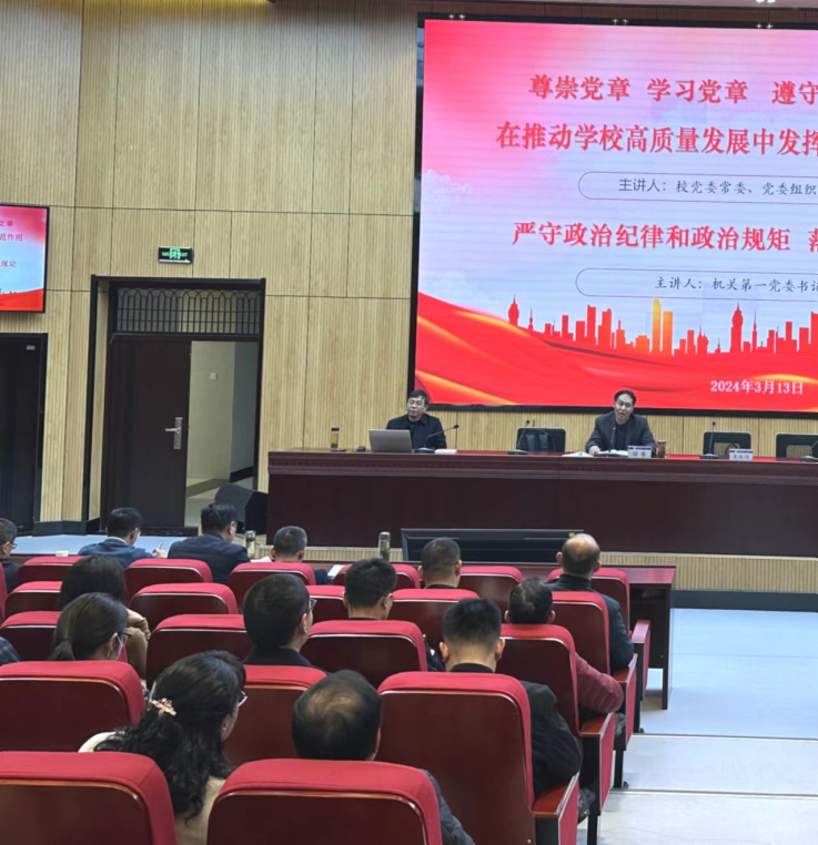 机关第一党委为贯彻落实“三会一课”制度,按照学校党委的工作部署,结合机关工作实际,3月13日下午,在徽韵楼二楼报告厅组织了2024年第一季度党课。校党委常委、组织部长、校党校副校长吴运传和机关第一党委书记徐军分别为机关一党委党员干部、入党积极分子150多人作了党课报告。