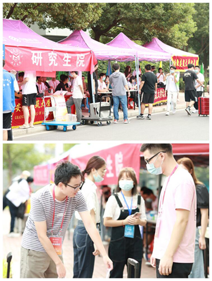 伴随着金秋九月的晨风,2021级研究生新生带着满怀希冀,步入徽弘门,开启求学生涯的新篇章。副校长张亚新、蔡国军来到迎新现场指导工作,并同报到新生进行亲切交流。研究生党支部党员发挥模范带头作用,为新生入学报到提供指引,帮助新生搬运随身行李,担当新生报到路上的“引路人”。研究生院全体教职工带领研究生会团队,分工协作,在新生报到处全天服务,完成核对报到信息,发放校园卡和安排新生住宿等一系列工作。此次迎新工作中,研究生院师生协作,顺利完成南北校区802位研究生的入学报到工作。