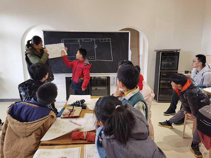 此外,本次授课还采用共建理念,邀请自然学校的小学生们参与设计。教学过程充分尊重校园使用主体的需求和体验,让小朋友“说出来”、“写出来”、“画出来”,最后由我们的研究生同学设计出来。这一过程也是把乡村美育和大学教育相结合的尝试,打通儿童绘画与专业设计之间的阻隔,让小朋友们具有获得感和自信心,也为艺术学院《艺术乡建》课程的学生带来不一样的体验和收获。