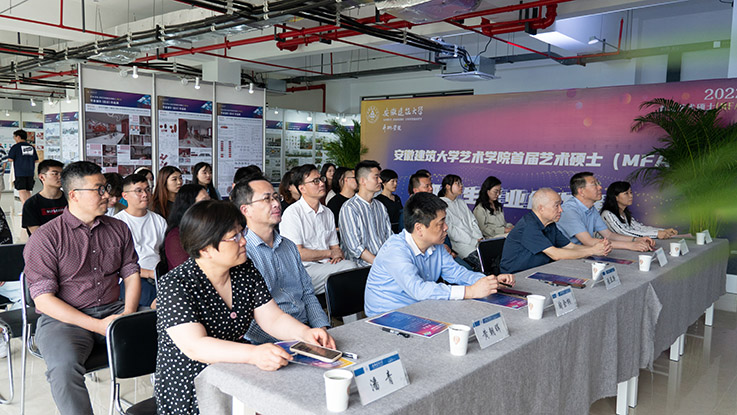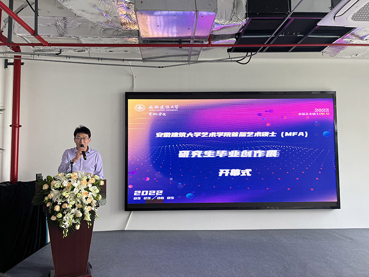 本网讯  5月26艺术学2022首届艺术硕士毕业创作(设计)作品展在实训综合楼二楼展厅隆重开幕。校党委常委、副校长张亚新、研究生院院长朱达荣、合肥工业大学建筑与艺术学院教授陈新生、安徽安兴装饰工程有限责任公司董事长陶余桐艺术学院党政领导、硕士生导师、研究生出席。本次开幕式由艺术学院副院长邢瑜主持。