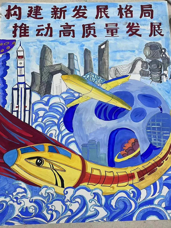 22视觉传达专业的刘馨聪等人以“加快构建新发展格局,着力推动高质量发展”为主题,展现了党带领人民取得的伟大成就,体现了我国埋头苦干、奋勇前进,在新时代新征程上风雨无阻向前进,夺取全面建设社会主义现代化国家新胜利的决心与信念。