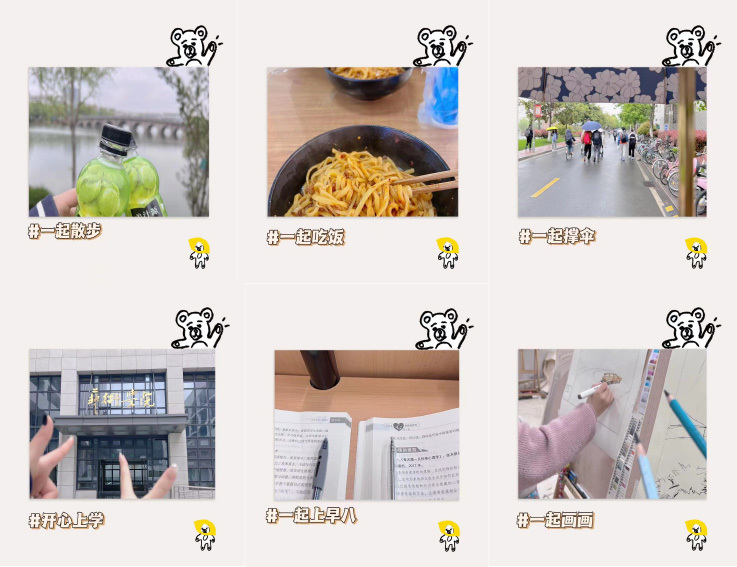 同学们围绕友谊、景色、生活、学习等主题收集影像素材,积极“打卡”、“签到”,每天记录美好、定格美好,分享每天的美好瞬间,消解学习压力,消除负面情绪,向身边的朋友们传递积极向上的正能量。易海湖畔,清风轻抚面颊;校园餐厅,大碗的美食喷香扑鼻。在柔风细雨中撑伞互助,在朗朗晨光中奋斗自强,同学们将这些平凡而美好的温馨瞬间化作定格画面,向同学、室友传递幸福、分享喜悦。