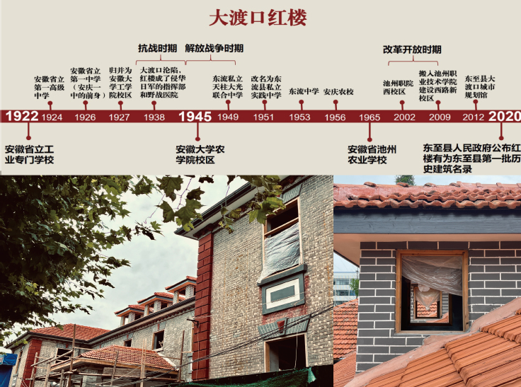 大渡口镇为全国重点镇,隶属安徽省东至县,为东至境内唯一使用官话方言的地区。在古建筑方面,大渡口镇有一座著名百年建筑“红楼”。该楼始建于民国初期,原为池州农校旧址,距今已有百年历史,分南北两楼,当地称姐妹楼。本次三下乡主题实践设计选择的地点为南红楼,该楼始建于1922年,历史悠久,是地方重要的历史建筑,承载了几代人的回忆;楼体坐西朝东,建筑面积 1780 ㎡,三层砖木结构,平面布局严谨;在设计风格方面以清水砖墙搭配红瓦坡顶,端庄大方,古朴典雅,具有西洋建筑风格。