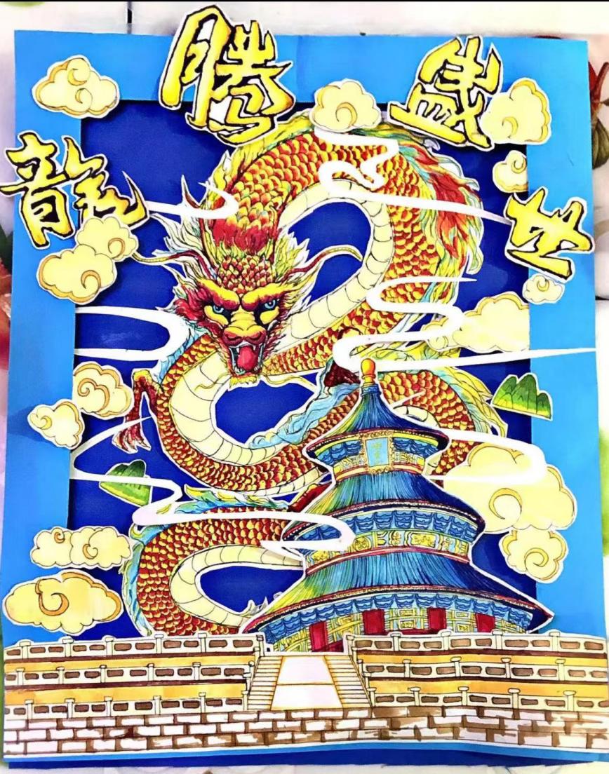 23级环设1班胡莘宇的作品将龙以巧妙的方式融入中国建筑的剪贴艺术中,画面上的巨龙蜿蜒盘旋,气势磅礴,祥云缭绕四周,寓意着吉祥、和平和繁荣。祥云的吉祥如意与龙的硬朗风格形成了鲜明的对比,更加突显了龙的神圣和威严,也展示了中华民族对于龙年盛世的向往和追求。