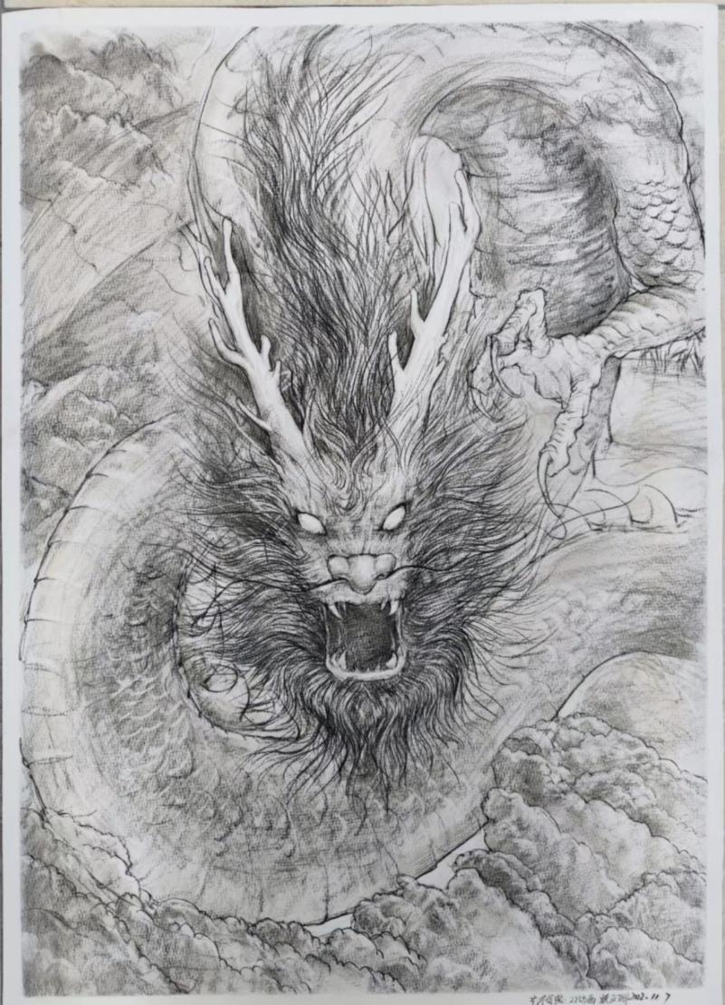 22级动画班鲍文娜的作品《龙腾在天》采用全因素素描的方法,画中描绘的龙与云朵相互依偎,气质庄重而威严,展现出强大的力量,充满了无尽的想象空间。