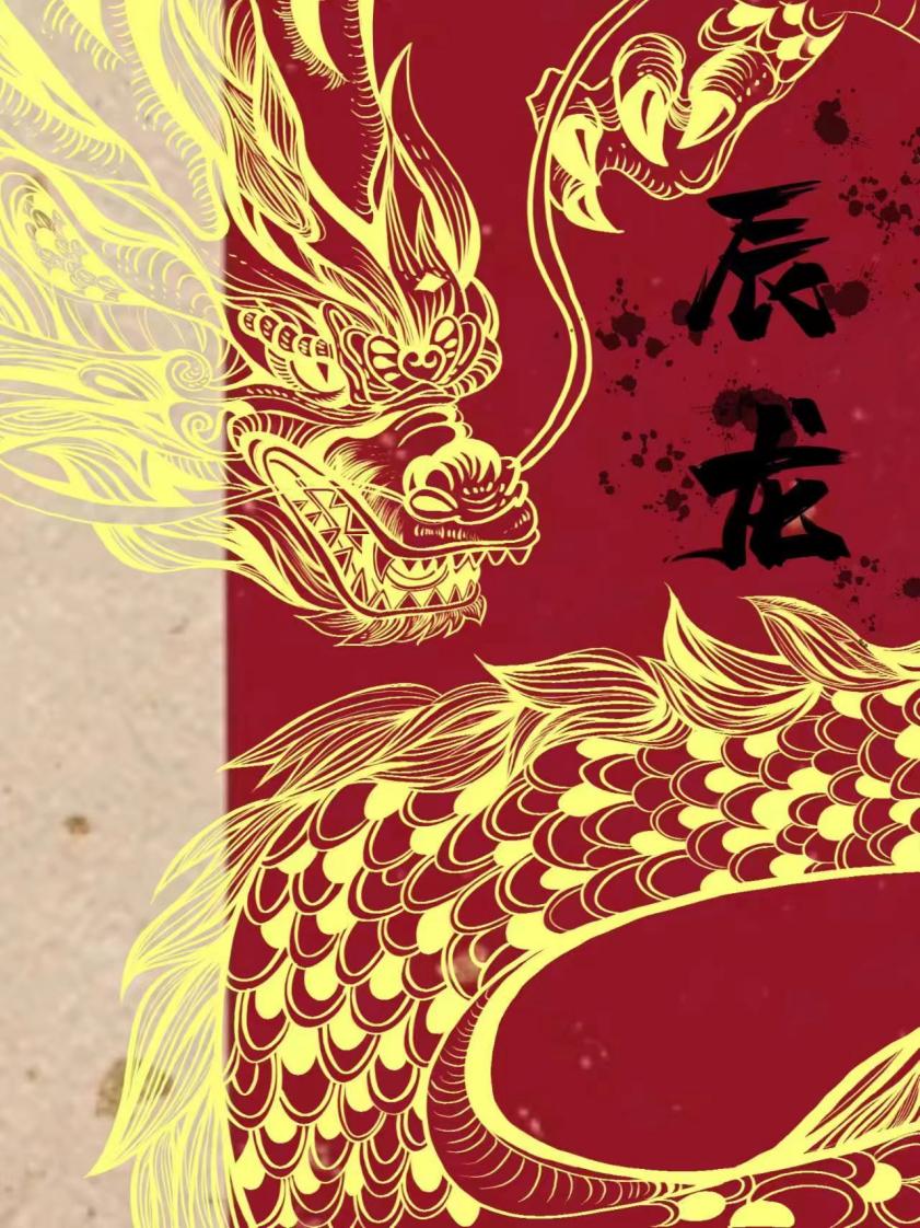 23级环设1孙皖粤的绘画作品将绘画与书法巧妙地结合在一起,红白背景的拼接设计,简约而不失大气,为画面注入了强烈的视觉冲击力。在画面中央,一条甲辰祥龙跃然纸上,其形态矫健,气势磅礴,仿佛要破纸而出,充分展现了龙的勇敢奋进、活力无穷。