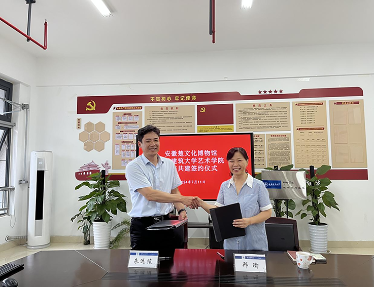 本网讯 711日上午,安徽楚文化博物馆副馆长朱远俊、陈列部赵晓雨、典藏研究部杨琨一行来我校调研。艺术学院副院长(主持工作)邢瑜、副院长黄朝晖、教学办主任孙强、非物质文化遗产保护传承创新团队负责人陈治军等参加了座谈。双方正式签订合作共建协议,将积极推进安徽楚文化博物馆和艺术学院在各自优势领域开展全面合作,共建实践教学基地,创新高校大学生实践教学方式,推进科研课题合作与成果转化,依托馆藏传统文化艺术精品赋能高等教育发展,服务安徽文化建设,促进楚文化历史资源活化与应用,传播中华优秀传统文化。