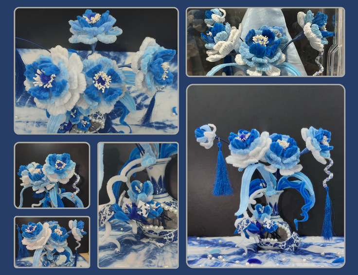 作品明制凤冠通过红、白、蓝三种主色调的精妙配合,融合了扭扭棒、布料等多种材料,成功呈现了明代凤冠的华丽与典雅。不仅展现了学生对中华民族优秀传统文化的理解和感悟,也反映了他们在创作中进行自我认同与情感释放的过程。每一次细致的构建、每一个细节的雕琢,都是对艺术与情感的深度共鸣。