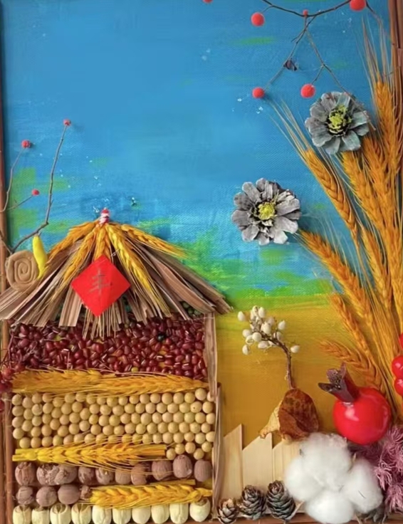 同学们以五谷为媒,以中华文化为核心主题,运用龙、熊猫、和平鸽等典型形象,展现民族精神与文化内涵。龙的形象象征中华民族深厚的文化底蕴与生生不息的奋斗精神;火箭升空、宇航员飞天的设计,展现了中国在航天科技领域的飞速发展与民族自立自强的时代精神。作品整体以劳动、收获和希望为核心意象,通过构图、色彩与寓意的巧妙融合,表达了同学们对文化传承的责任感以及对国家未来发展的坚定信心。