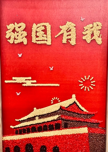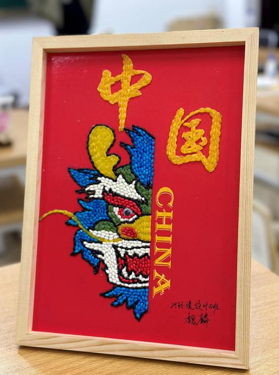 同学们五谷为媒,以中华文化为核心主题,运用龙、熊猫、和平鸽等典型形象,展现民族精神与文化内涵。龙的形象象征中华民族深厚的文化底蕴与生生不息的奋斗精神;火箭升空、宇航员飞天的设计,展现了中国在航天科技领域的飞速发展与民族自立自强的时代精神。作品整体以劳动、收获和希望为核心意象,通过构图、色彩与寓意的巧妙融合,表达了同学们对文化传承的责任感以及对国家未来发展的坚定信心。