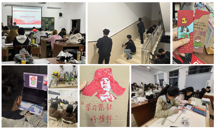 扎根服务实践根基。艺术学院团委组织各团支部于3月5日开展系列实践活动。志愿者们化身图书管家,在校图书馆完成书籍整理、书柜清洁及空间优化工作。同步开展的雷锋精神知识竞赛、雷锋形象IP设计大赛、“学雷锋”主题板报创作等活动,通过废旧材料艺术再生、文化符号青春化演绎等创新形式,使思政教育融入校园每个角落,以设计思维重构雷锋形象,用艺术语言续写奉献篇章,为校园文化注入鲜活生命力。