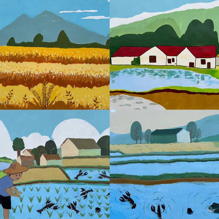 针对当地稻虾共作特色产业,杨芳老师带领学生们创作了《二十四节气图》,其中《夏至》《秋分》两幅墙绘极具代表性,画面中,农户们在田间劳作,水田插秧、稻穗金黄、虾肥鱼跃,细腻生动呈现在墙面上。村民们驻足观赏,感慨不已,“这些画把农忙生活变成了咱能看懂的画面,党的好政策就像这稻穗一样,在我们这里结满了幸福。