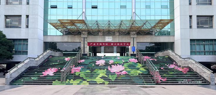 在师生们精益求精的妙笔描绘下,清新雅致、意境悠远的荷塘画卷跃然阶梯立面,宛如铺展于校园的巨型水墨长卷,为校园注入了浓郁的艺术气息。楼梯画创作将公共空间转化为艺术载体,使其成为校园中一处极具吸引力的文化地标,让艺术之美走出画室,展现在师生学习生活的公共空间,让美育实现“润物细无声”。此次创作也为同学们提供了宝贵的沉浸式实践教学,锻炼了他们的空间构图、复杂环境下的色彩运用、大型项目协作等方面的能力,深化了对艺术创作从构思到落地全过程的理解,提升了综合艺术素养。