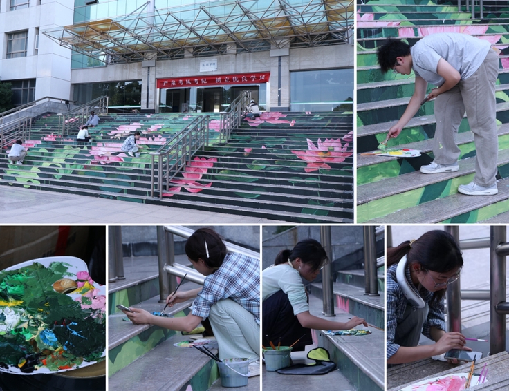 本网讯 为建设文明美丽校园,推动美育教育与校园文化建设的有机融合,营造浸润式美育环境,学校党委学工部联合艺术学院精心组织“匠心巧绘荷塘韵 阶梯焕彩艺术廊”主题实践活动。艺术学院师生充分发挥专业优势,将徽学楼的阶梯立面打造成一幅流淌着江南诗韵的荷塘画卷,成为校园中一道引人入胜的艺术景观长廊。