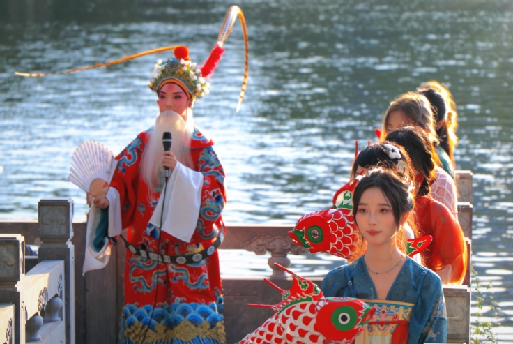活动筹备自八月中旬启动,学院领导班子高度重视,专业教师、学院团委积极响应,和校团委、体育教学部组建专业策展团队,实施“日清周结、责任到人”的项目化管理机制,系统推进活动进展艺术学院师生依托自身专业特色,组织非遗展示单元的设计与布展,将非遗元素进行当代化转译涵盖傩戏面具、木刻版画、绒花、民俗服饰等徽州传统工艺品,以及大幅藤编、大型鱼灯、大型剪纸等传统艺术作品,同时组织书法、国画、葫芦刻画等手工艺作品展,现场形式多样丰富,得到了参与嘉宾新生家长们的一致好评。特别是动态演出环节黄梅戏展演,青年师生演出《天仙配》《女驸马》等经典唱段,展现戏曲艺术魅力让人印象深刻夜间的花灯巡游环节,紫云路校区灯光璀璨,非遗文创、鱼灯巡游与戏曲演出交织,吸引众多新生驻足,气氛热烈。