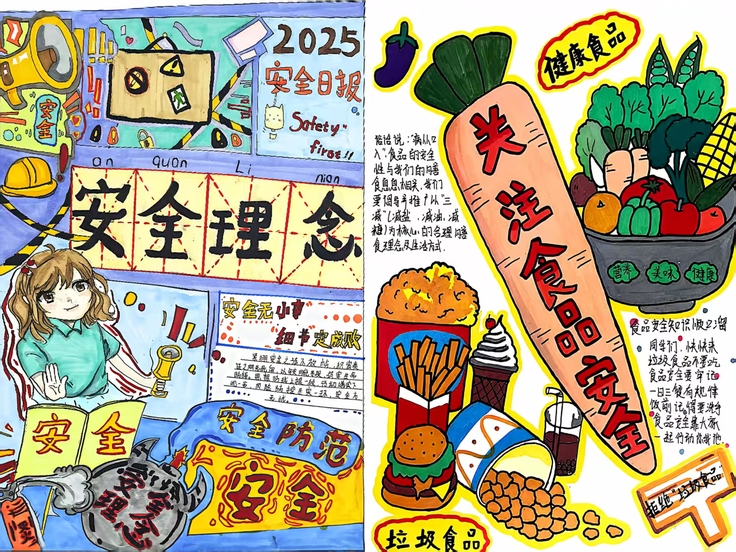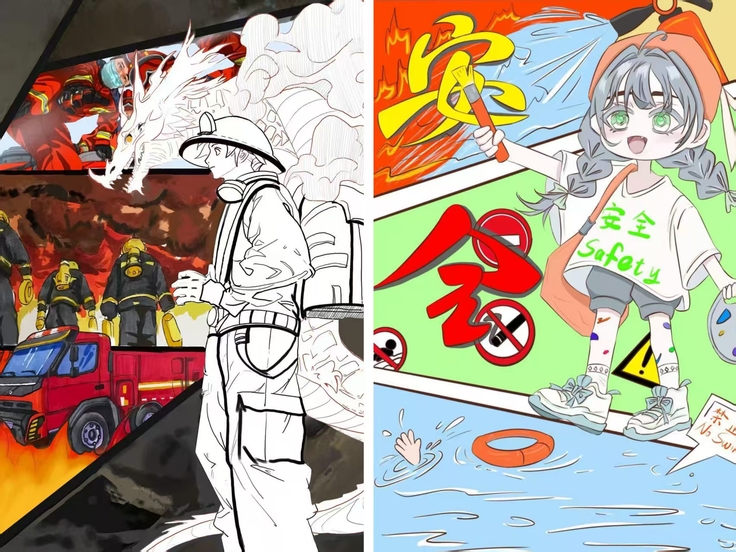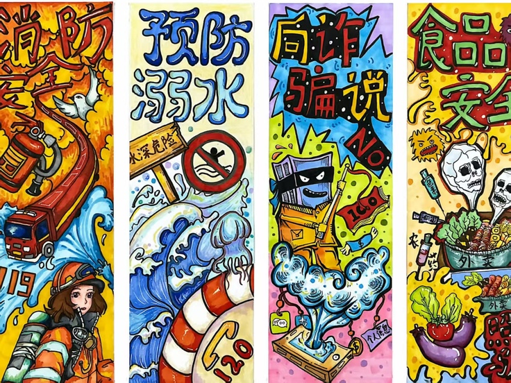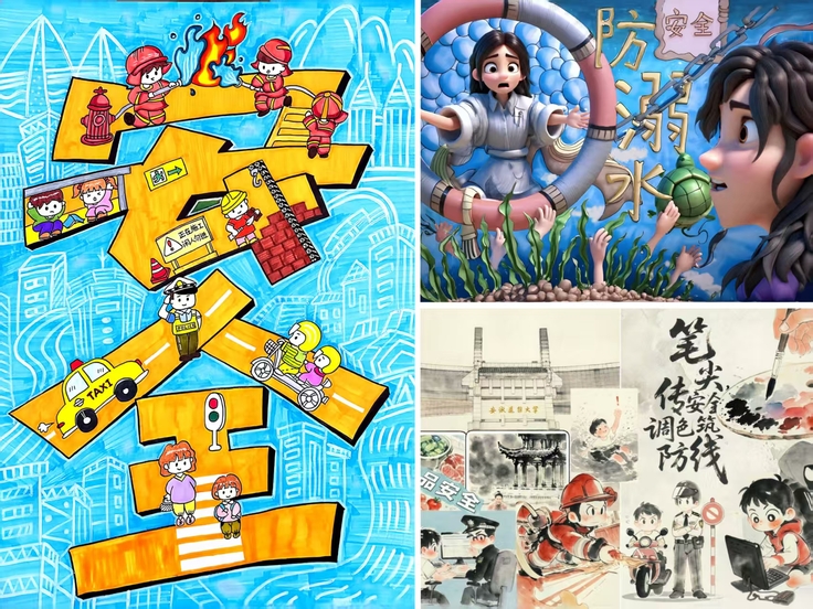 活动作品涵盖消安全、食品安全防溺水、防诈骗等多个主题,表现形式多样创意突出。有的运用漫画分镜,将消防场景与科普元素结合,生动传递安全知识;有的通过手绘艺术字,将安全标识与生活场景融合,直观呈现“安全无小事”的理念;有的设计系列竖幅作品,分别聚焦不同安全主题,色彩鲜明、警示性强还有作品采用立体造型或水墨手法,增强视觉冲击力的同时,体现了传统文化与现代安全的交融。