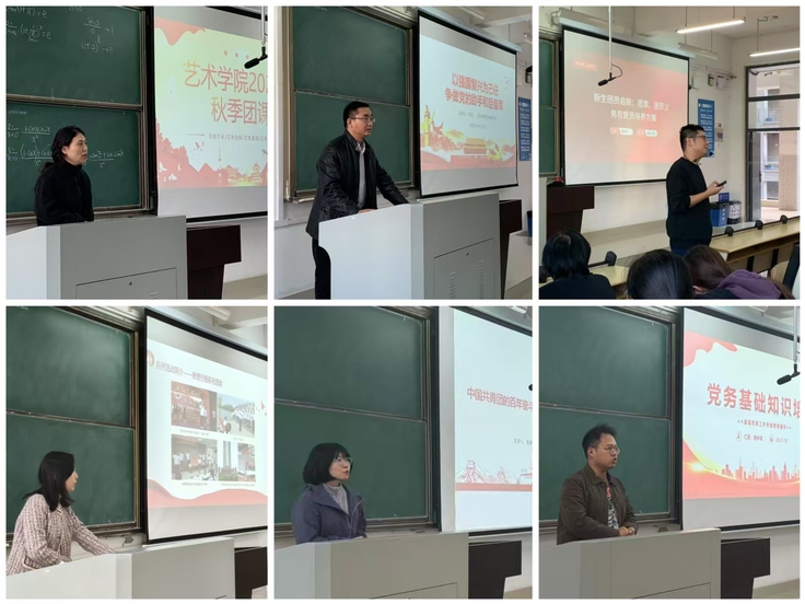 院党委副书记任磊聚焦“以强国复兴为己任,争做党的助手和后备军”主题,深刻阐释团员青年的责任定位与时代使命,鼓励大家坚定理想信念,挺膺担当,奋力谱写强国复兴的青春篇章。校团委岳琦老师围绕“青春跟党走,建功新时代”,结合艺术专业特色,号召团员将艺术追求与时代发展同频共振。学院团委书记孙长玥以“实践育人筑牢信念根基”为切入点,引导同学们在实践中锤炼品格、坚定信仰;辅导员管皓宇聚焦“新生团员启航”,助力新同学快速融入组织、明确成长方向;辅导员袁婧卓带领同学们回顾“中国共青团的百年奋斗历程和历史启示”,从百年征程中汲取奋进力量;辅导员施林坡以“坚持党旗所指就是团旗所向”为题,强调团员青年应紧跟党的步伐,自觉听从党和人民召唤,努力建功立业。
