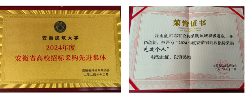 砥砺前行,硕果累累。招投标管理办公室的工作取得了显著成效,赢得了省属高校的广泛认同和关注,2024年接待了安徽工业大学资产与实验管理处、阜阳师范大学国有资产管理处、合肥师范学院国有资产管理处以及安徽省建筑工程招标投标协会来校调研工作,就招标采购管理等方面问题进行了深入学习交流。我校在高校采购领域勤勉敬业、勇挑重担、团结互助,被评为“2024年度安徽省高校招标采购先进集体”;招投标管理办公室冷雨童同志在高校采购领域履职尽责、开拓创新、无私奉献,被评为“2024年度安徽省高校招标采购先进个人”。