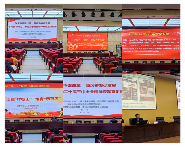校党委常委、宣传部部长徐庚阳以《情满江淮擘画卷自当进取谱新篇》为题,就学习宣传贯彻落实习近平总书记考察安徽重要讲话精神进行宣讲;统战部常务副部长、长三角高等教育一体化示范区共建办主任朱涛以《学思践悟促改革踔厉奋发谋发展》为题,就贯彻落实党的二十届三中全会精神,结合学校实际,进行针对性解读;校党委常委、组织部(党校)部长吴运传以《守好“一段渠” 种好“责任田》为题,重温了《中国共产党普通高等学校基层组织工作条例》等党内法规制度,坚持问题导向,围绕省委巡视、校内巡察反馈的基层党建问题,党建检查督查发现问题,党员发展专项治理需要解决的问题,进行了分析研判,提出推进整改落实意见。本着分层分类、务求实效的原则,公管学院副院长连瑞瑞以《创建“样板田” 培育“示范区”》为题、合肥工业大学微电子学院党委副书记张发宇以《聚焦“七个有力” 推进“一融双高”》为题,分别与参训学员分享了新时代全国全省党建双创“样板党支部”培育创建好做法好经验。