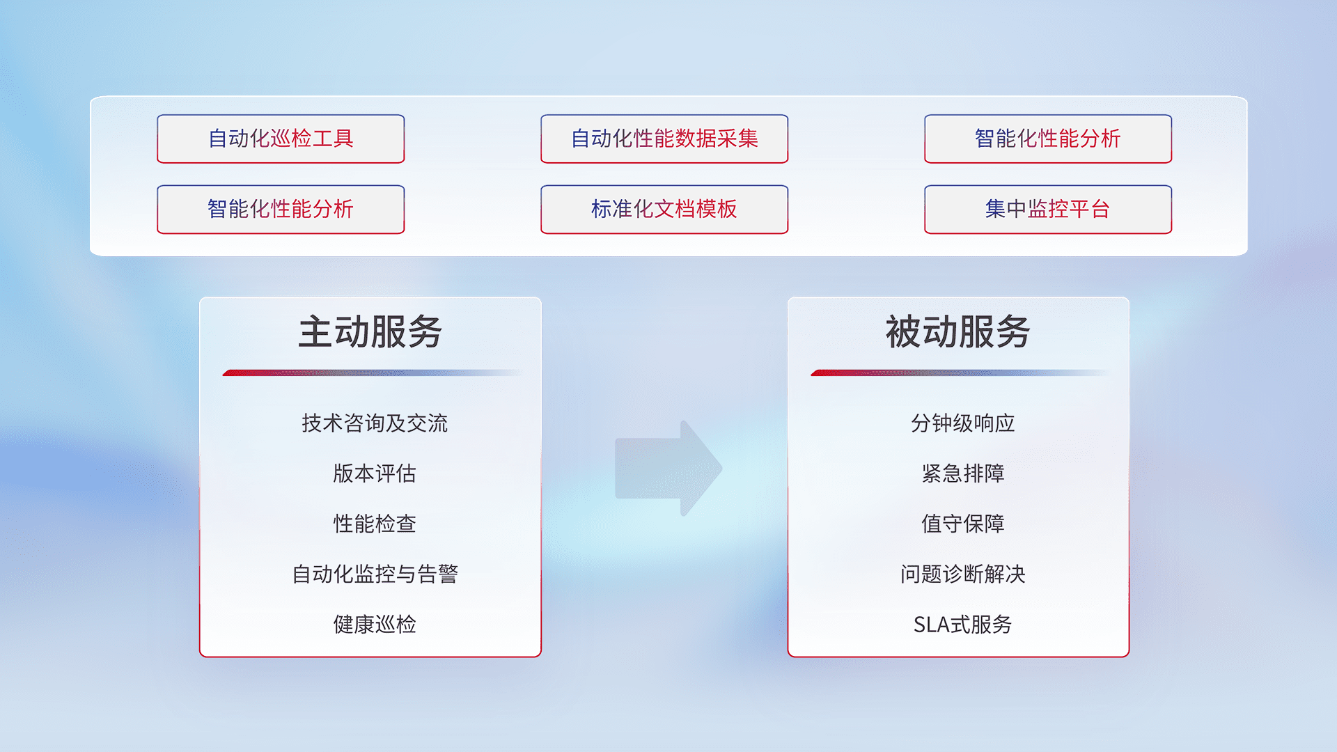 智能化工具和标准化文档,,保障服务质量,,,提供主动服务(包含技术咨询、、、、版本评估、、、性能检查、、自动化监控与告警、、、健康巡检)和被动服务包含(分钟级响应、、紧急排障、、、、值守保障、、、、问题诊断解决、、、SLA服务)。。。